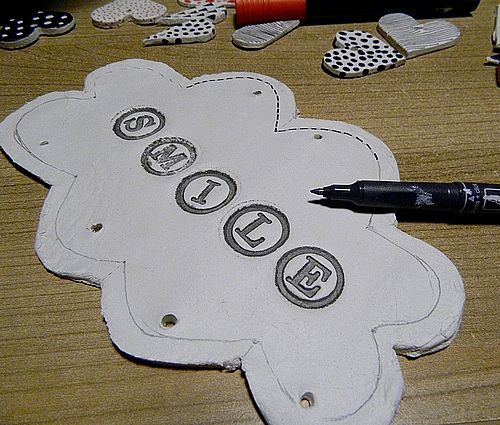 Нещо за пробиване на дупчиците, аз ползвах пиронче, но може да се ползва обикновена клечка за зъби. Тази глина съхне без печене, ако я оставите някъде на топло за едно денонощие надписа ще е сух.
