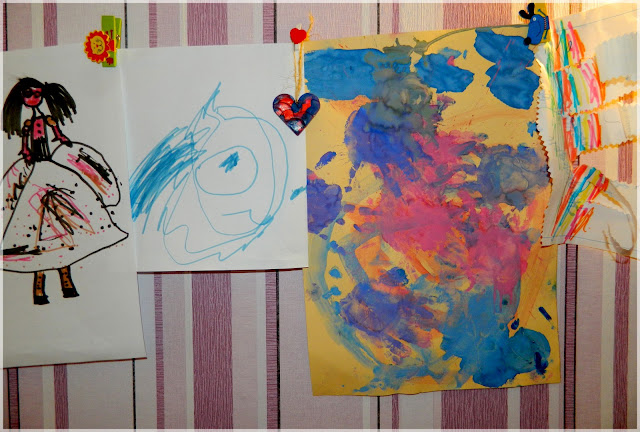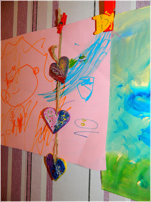 Това са малките човечета на Дари и глинените украшения които си правихме заедно преди няколко дни. Идеята да окачим тази пъстрота така, не е наша, нито нова, видях я миналата година пролетта. Детската стая, не е за рисунките защото те са предназначени за мен и тати. Хладилника ни побира само малка част. Чудех се къде може да сложим връвчица.