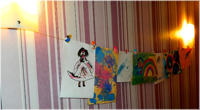Не се чудете, това е нашия коридор, сега в него момичетата си имат своя художествена галерия. А ние, всеки ден им ходим на изложбите. Това е първоначалния малко набързо измислен вариант от Нашата изненада. Опънахме памучна връвчица в скучно-дългия  коридор между двете лампи. И закачихме всичките рисунки на момичетата от последната седмица.