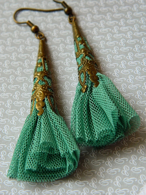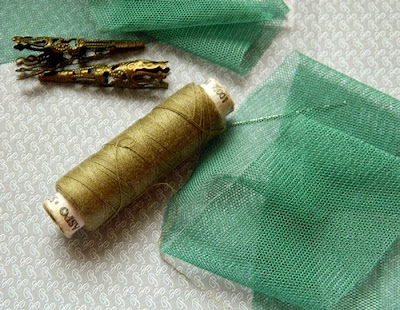 Нужни са две бижутерски игли, две капачета, тюл с ширина 5см. и две малки мъниста, бижутерски клещи резачки, бижутерски клещи с кръгли рамена, игла и конец.