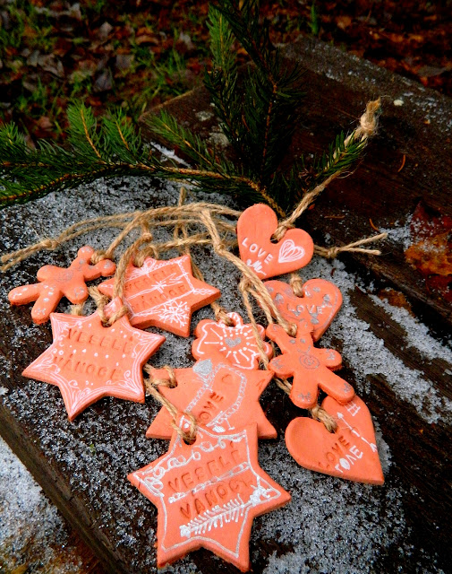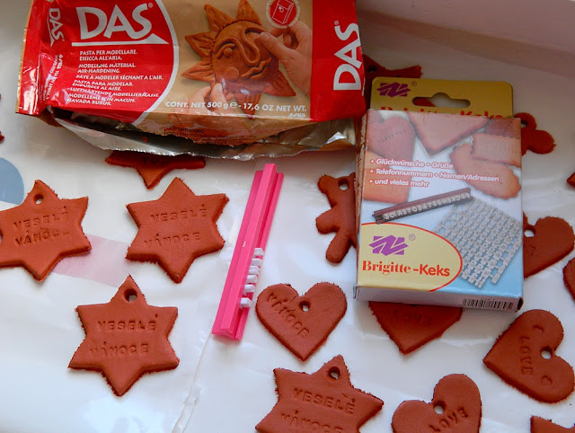 От кафява DAS - глина изрязахме с матални формички за сладки : звездички, сърца и мечета.