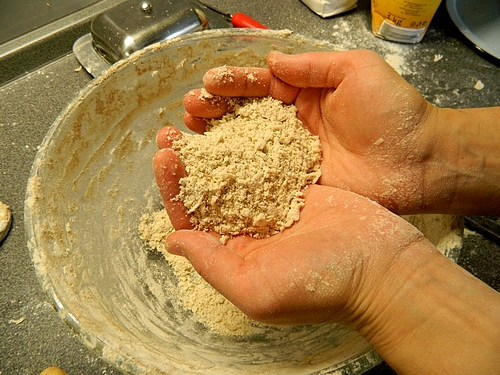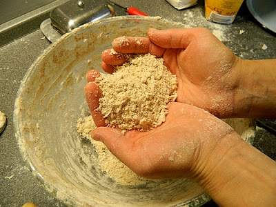 Когато искам да не меся за дълго, към топчицата, която обикновено прибирам в хладилника добавям още брашно, обикновено фино, ръжено. Добавям и премесвам с тестото докато стане на трохи. Количеството трохички зависи от големината на топчицата с която съм започнала.