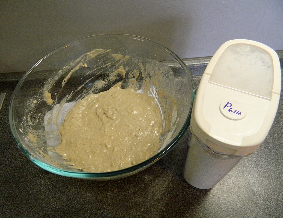 Готовата от нощта закваска се разбива добре с половината от водата. Оставяме гъбите за 30мин. предварително да киснат в малко вода.